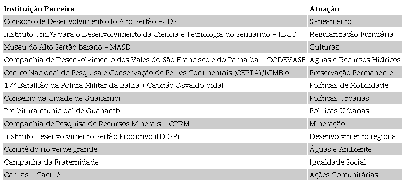 Desde sua inauguração, na cidade de Guanambi, o Observatório UniFG, principalmente a partir do Núcleo de Pesquisas em Direito à Cidade em parceria com o Laboratório de Geoprocessamento, estabeleceu parcerias significativas (Tabela 02).
