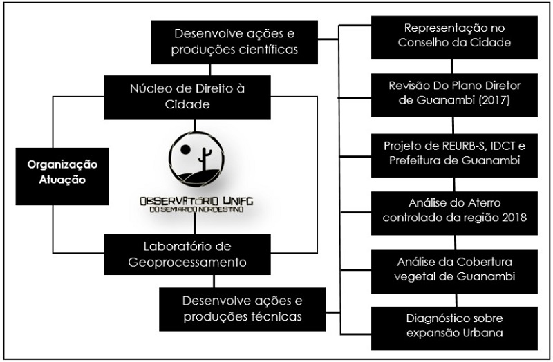 De acordo com os dados disponibilizados pelo website oficial do Observatório1 , atualmente a unidade de pesquisa se subdivide em um laboratório e seis núcleos de pesquisa, em específico da seguinte maneira: laboratório de Geoprocessamento, que instrumentaliza os dados articulados junto aos núcleos de pesquisa; Núcleo de pesquisa Direito à cidade, 2) Núcleo de pesquisa recursos hídricos e climatologia, 3) Núcleo de pesquisa Conservação da biodiversidade, 4) Núcleo de pesquisa Saúde coletiva, 5) Núcleo de pesquisa Toxicologia Ambiental, e 6) Núcleo de pesquisa Educação e cultura. Todas essas temáticas são lideradas por professores pesquisadores da área, sempre vinculando o objeto à região semiárida. A coordenação geral, 2 pesquisadores fundadores, que representam externamente o Observatório e suas pesquisas2.