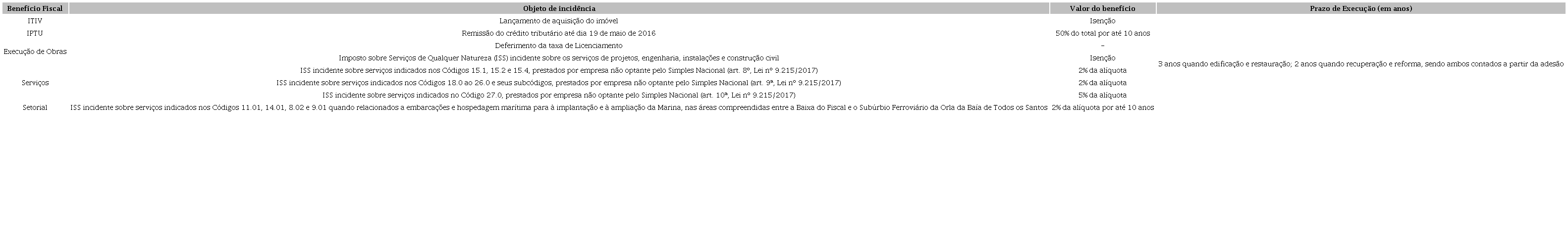 Já o Programa Salvador 360, inspirado no Programa SIMPLEX criado em Portugal, desenvolveu distintos eixos visando o aceleramento do crescimento econômico e social da cidade (Salvador/Casa Civil, 2017). Entre os eixos, o que impactou diretamente os incentivos fiscais para o CAS foi o “Centro Histórico”, que tinha o intuito de realizar intervenções públicas que culminasse na dinamização econômica e urbana da área, bem como ações de regulamentação e concessão de incentivos.