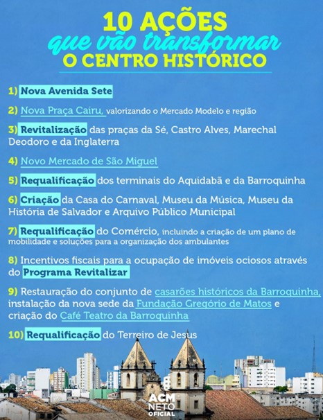 Magalhães Neto, A. C. (2017). Bom dia! Olha aí algumas ações que o #Salvador360 está trazendo para o Centro Antigo. Twitter publicado pelo ex-prefeito de Salvador, ACM Neto, sobre as 10 ações que vão transformar o Centro Histórico. Recuperado em 30 de novembro de 2022, de https://twitter.com/acmneto_/status/902167138781319170.