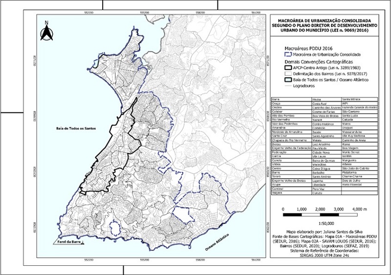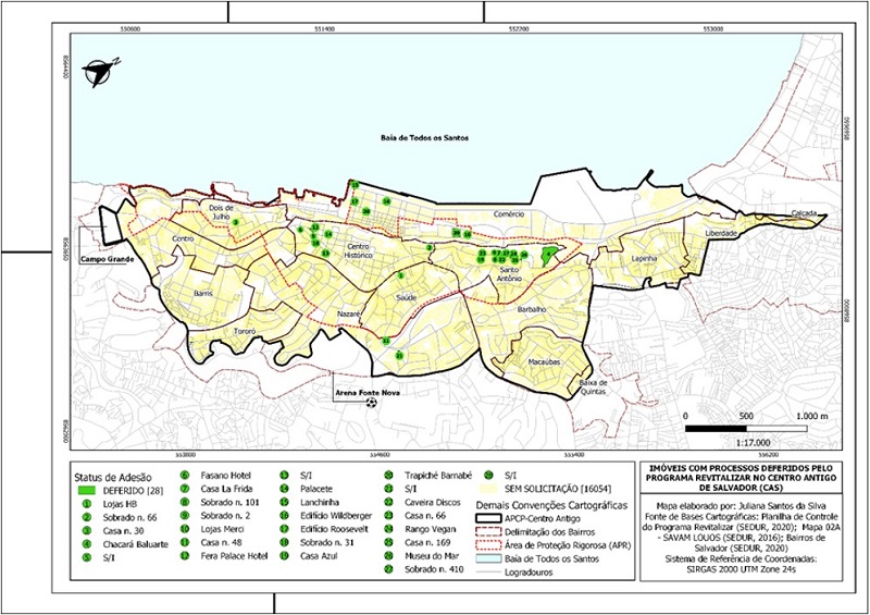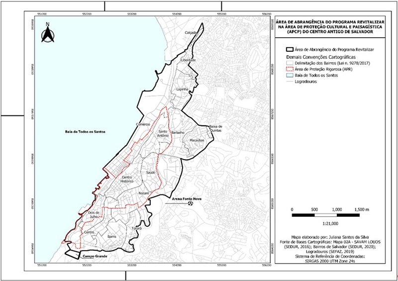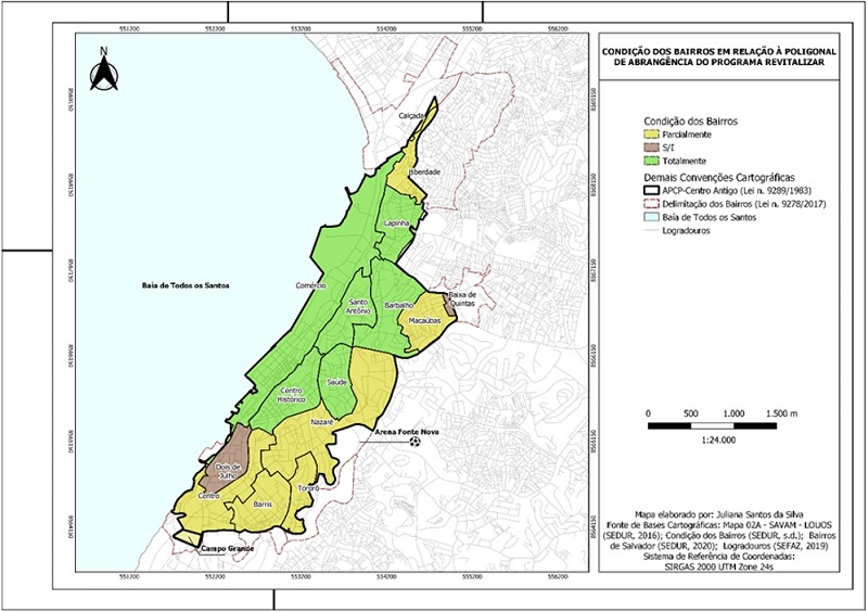 Em maio de 2017, Programa Revitalizar foi instituído como lei municipal: a Lei nº 9.215, de 19 de maio de 2017 e foi regulamentado pelo Decreto nº 28.775, de 19 de agosto de 2017 (Salvador, 2017a, 2017b). A Lei do Programa Revitalizar restringe a concessão dos benefícios fiscais para a poligonal da APCP do Centro Antigo – a Lei nº 3.289/1983 divide as zonas de proteção do núcleo antigo de Salvador em Área de Proteção Rigorosa (APR) e Área de Proteção Contíguas às de Proteção Rigorosa (APCR), bem como instituiu a referida APCP e a condicionou como poligonal delimitadora de práticas de preservação associadas ao planejamento urbano (Salvador, 1983) – e ao Conjunto Urbano e Arquitetônico da Cidade Baixa (Figura 5), que abrange quinze bairros: Centro Histórico, Baixa de Quintas, Dois de Julho, Centro, Santo Antônio, Lapinha, Barris, Tororó, Nazaré, Saúde, Barbalho, Liberdade, Macaúbas, Calçada e Comércio (Figura 6).