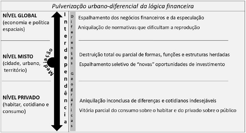 Por sua vez, o termo “urbano-diferencial” remete a dois aspectos: a) integração dos níveis urbanos global, misto e privado que, mediados pela cidade, transpõem a noção de escala; b) diferenças geográficas oriundas do movimento dialético/sistêmico atrelado aos múltiplos contextos históricos e geográficos em que a pulverização acontece.