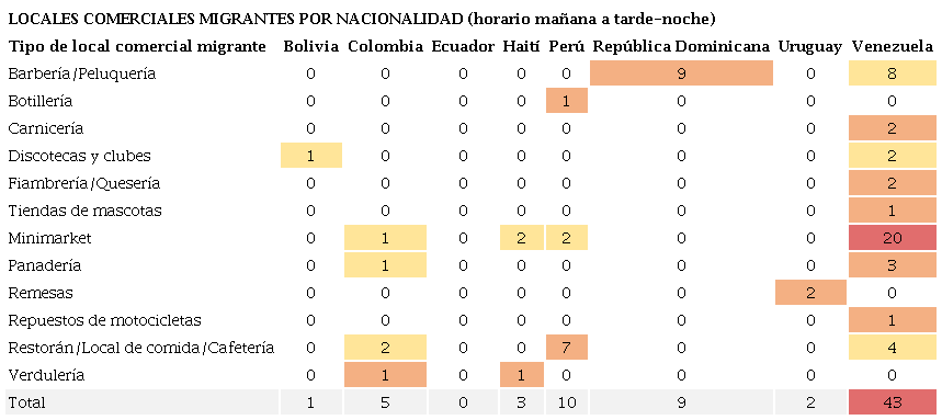 Por otra parte, también se identificó la especialización de ciertas nacionalidades en tipos de negocios. Así, los restoranes/locales de comida son principalmente de nacionalidad peruana (53,8%), las verdulerías haitianas (66,7%), las barberías dominicanas (52,9%) y las empresas de remesas uruguayas (100%). Incluso estas dos últimas tienen a los respectivos rubros como los únicos que desarrollan en el barrio.