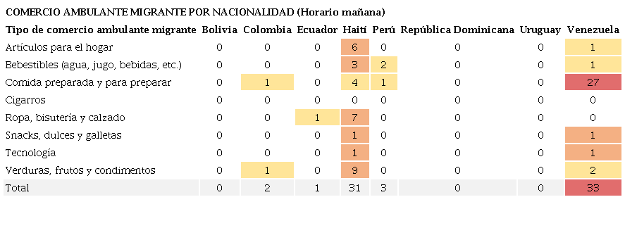 Respecto al CAM, se evidencia que los resultados son variables dependiendo de los diferentes horarios del día. De esta forma, durante el horario de la mañana (Tabla 2), existe una predominancia de comerciantes ambulantes de nacionalidad venezolana (47,1%) y haitiana (44,3%). En este caso, es especialmente interesante notar que el CAM de nacionalidad haitiana tiene la mayor presencia en casi todos los tipos de actividad (a diferencia de su presencia en los LCM) con excepción de la comida preparada, la cual para el CAM de nacionalidad venezolana representa el 81,8% de sus actividades.