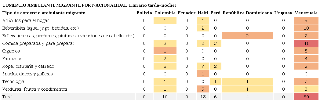 Por último, durante la tarde-noche (Tabla 3) se presenta la mayor concentración y diversidad de CAM en el barrio, donde se conforma una calle activa en Avenida Toro Mazotte, en que la comida preparada (37,7%) y venta de ropa, bisutería y calzado (15,7%) se vuelven las principales actividades, donde el CAM venezolano (70,1%) toma un claro protagonismo. Con esto, también aparecen otros productos como fármacos, cigarros y productos de belleza, que tenían escasa presencia en los horarios anteriores. Sobre esta situación, es igualmente interesante el aumento cuantitativo del CAM (de 65 a 127 puestos) y, en particular, de grupos como los usuarios dominicanos, especializados en vender productos y servicios de estética (al igual que en los LCM), así como en la presencia de prácticas de socialización-recreacionales asociadas al comercio y a la escasez de áreas verdes barriales, siendo la calle activa el lugar con mayor permanencia de este tipo de prácticas en el espacio público.