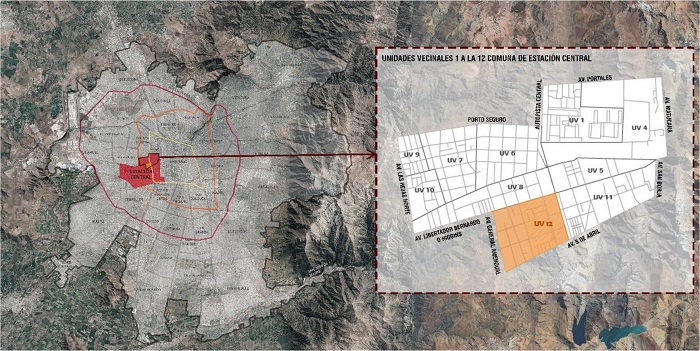 Administrativamente, se localiza en la macrozona norte de la comuna, en la unidad vecinal 12 (Ilustre Municipalidad de Estación Central, 2017). Esta área se caracteriza por tener un uso de suelo mayoritariamente residencial, con viviendas tradicionales de 1 a 2 pisos, construidas para trabajadores de Laboratorios de Chile en la década de 1960 (Mora, 2023), y edificaciones en altura de entre 5-31 pisos, con hasta 1.036 unidades habitacionales por edificio, construidas, primero, en oleadas sucesivas entre los años 2008 a 2017 (Rojas-Symmes, 2020) y, segundo, otras posteriores finalizadas entre 2018 a 2023 (Mora, 2023).