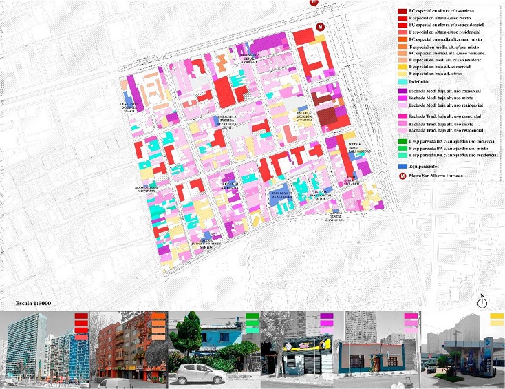 Al realizar el cruce de información se obtuvieron 21 tipologías edificatorias. Para su identificación se desarrolló un mapeo, utilizando como base la cartografía digital de Digimapas Chile (2020). Posteriormente, se establecieron 22 cuadrantes de análisis que sirvieron tanto para el levantamiento de las tipologías edificatorias como para la identificación de las prácticas cotidianas migrantes, pudiendo establecer además con precisión las dimensiones de las vías, según tipos de la Ordenanza General de Urbanismo y Construcciones (OGUC) de Chile (MINVU, 2024) y metros cuadrados de áreas verdes. Con toda esta información, se realizó la digitalización de los resultados para un mejor análisis y cruce de información dentro de un archivo digital único.