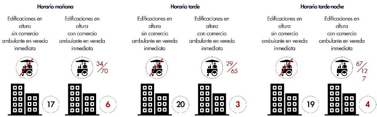 Mientras que, en el segundo, si bien la presencia es escasa considerando todas las edificaciones (Figura 3), incluso en el horario de mañana de mayor presencia junto a diferentes edificios (6 de 23), cerca del 50% de los comerciantes ambulantes, en los distintos horarios, se concentran frente a los edificios, que se encuentran en vías de servicio como Avenida Toro Mazotte y Coronel Souper, donde están la mayor parte de edificaciones en altura. Esto puede explicarse como una decisión táctica, frente a la alta presencia de población migrante en las edificaciones del sector con hasta 83,7% del total poblacional por manzana censal (INE, 2018), a la cantidad de personas que transitan desde el Metro San Alberto Hurtado, pero también, debido a la proximidad al lugar de residencia de los mismos usuarios (7 de los 8 entrevistados son residentes de edificios del sector).