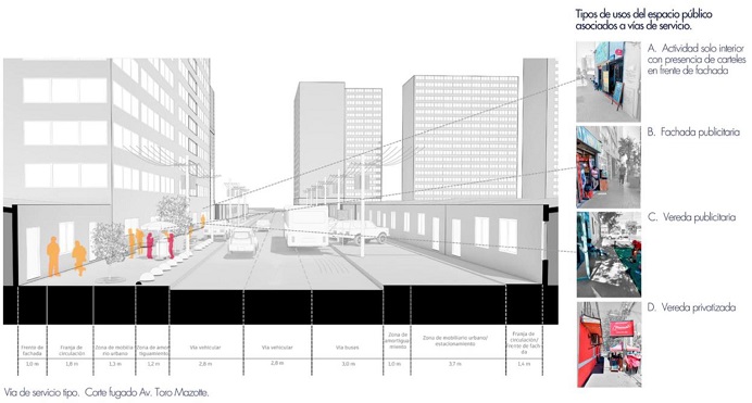En el segundo caso, están los LCM de actividad solo interior con uso de mobiliario en el frente de fachada, donde las prácticas comerciales se desarrollan sólo al interior del local y que suelen estar presentes en todos los tipos de vías del barrio. El tercer caso, se trata de las fachadas publicitarias, donde los vendedores utilizan el frente de fachada del LCM, estando de pie o disponiendo sillas, para atraer clientes hacia el interior del local. Este caso es especialmente notorio en vías expresas del barrio, donde los barberos tienen una presencia constante a lo largo del frente de fachada de avenidas como Libertador Bernardo O’Higgins. El cuarto caso es la vereda publicitaria, en que se disponen mobiliarios y/o vendedores, sobre el frente de fachada y la ZMU para atraer clientes hacia el interior del local, sin que ello implique una permanencia de ellos. Tal situación se observa más frecuentemente en los minimarkets de vías de servicio como Avenida Toro Mazotte.