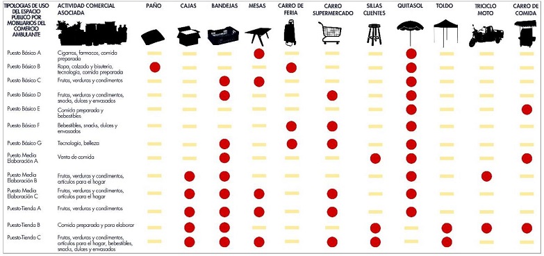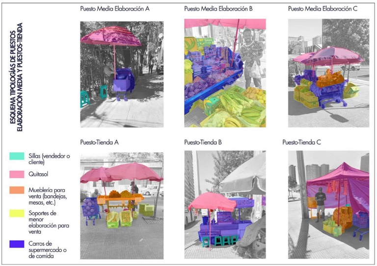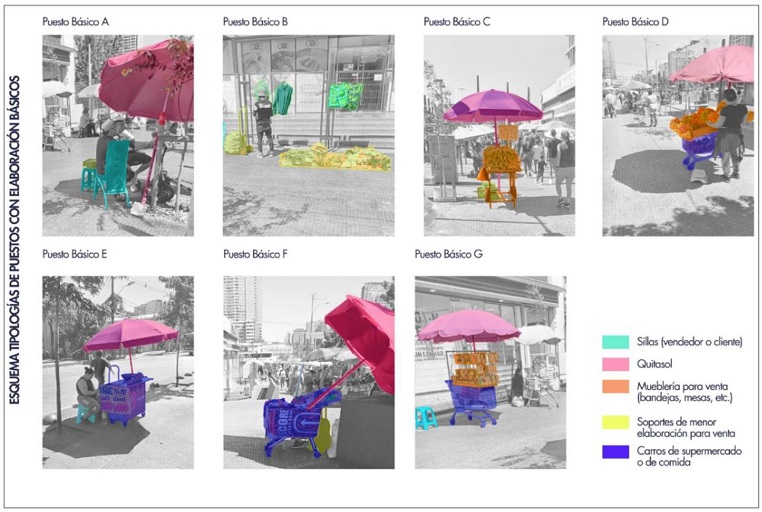 De esta manera, se reconoce que los puestos más básicos, disponen solo de un paño o bandejas para la venta y transporte de productos como cigarros, fármacos y ropa. Mientras que, los más complejos instalan tiendas, donde se dispone de multiplicidad de productos y mobiliarios como toldos, sillas y mesas para la permanencia de clientela en el lugar.