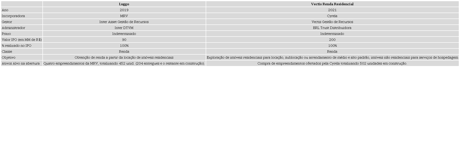 O Vectis Renda Residencial foi listado em 2021, captou R$ 200 milhões, e se assemelha ao Luggo quanto ao objetivo e na aquisição de unidades residenciais em construção. Contudo, difere no tipo de locação, no público-alvo (alta renda) e no papel desempenhado pela incorporadora Cyrela, maior incorporadora de capital aberto do país, presente em diversos estados além da Argentina e Uruguai. Segundo o prospecto de abertura do FII, além de finalizar e entregar as unidades, a Cyrela incumbiu-se de garantir uma rentabilidade mínima ao fundo por 36 meses (período de execução das obras). Neste ponto, comprometeu-se a garantir rendimentos de 7% a.a. sobre o capital investido pelos cotistas e a adquirir 5% das cotas, mantendo-as por sete anos. Trata-se de um arranjo onde a incorporadora fornece o produto e atua como partícipe e garantidora do fundo.