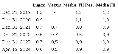 O Vectis comprou tanto unidades residenciais em construção quanto na planta. Assim, absorveu parte do estoque da incorporadora, melhorando o fluxo de caixa e o balanço patrimonial. Embora a temporalidade de locação seja diferente, a estratégia de manter unidades para locação, comprar unidades em construção e contar com a incorporadora como cotista aproximam esses dois FIIs em termos de dinâmica geral e influência da incorporadora. A participação delas é essencial para a viabilização operacional e financeira do FII, desempenhando um papel fundamental em moldar os ativos pelos quais o veículo financeiro extrairá rendas.