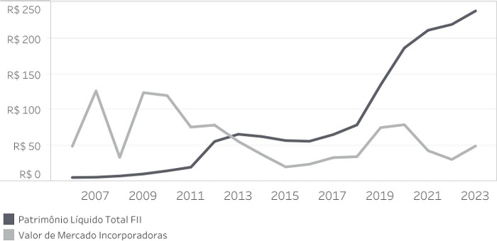 Historicamente, a incorporação imobiliária se constituiu como fração que combina diversos instrumentos financeiros para viabilizar sua produção, estando, desde sua concepção, próxima dos mercados financeiros e de capitais. Na esteira do processo de neoliberalização da economia brasileira, o FII foi idealizado, no início da década de 1990, como instrumento financeiro capaz de aproximar emprestadores e tomadores, fora dos esquemas tradicionais de financiamento bancário, e meio de dinamizar a produção residencial nacional. No entanto, observa-se o atual avanço desse instrumento em estoques já prontos, principalmente nos segmentos corporativos e comerciais, visando a geração de receitas por meio de aluguel. Mais recentemente, os FIIs avançaram sobre títulos mobiliários de base imobiliária, galpões logísticos e, em processo de desenvolvimento, o segmento residencial.