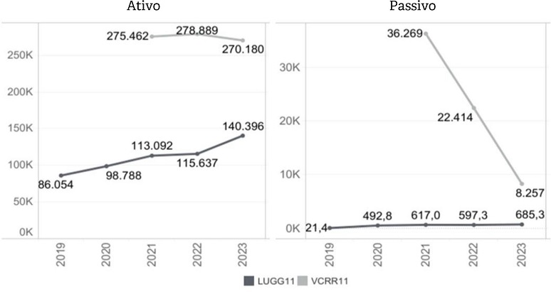 O gráfico 3 apresenta os resultados sobre a dimensão econômico-financeira dos fundos analisados. Em relação aos ativos (bens e direitos), o VCRR11 se destaca com o maior montante, cerca de R$ 270 milhões, enquanto o LUGG11 possui aproximadamente R$ 140 milhões. Ambos demonstram estabilidade nos ativos ao longo do período, oscilando pontualmente.