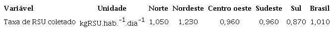 A taxa de geração per capita diária de RSU foi adquirida através de informações e dados dos indicadores do Sistema Nacional de Informações sobre Saneamento (SNIS) para manejo de RSU (SNIS, 2023), conforme Tabela 2.