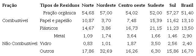 O fluxo de massa de cada tipo de resíduo para cada macrorregião foi calculado de acordo com a Equação 3 (Rodrigues et al., 2022), segundo sua composição gravimétrica, conforme (Gutierrez-Gomez et al., 2021), e em função das frações combustíveis e não combustíveis apresentados na Tabela 3.