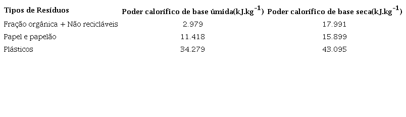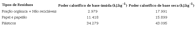 PCIt = Poder calorífico total dos resíduos em kJ.kg-1.