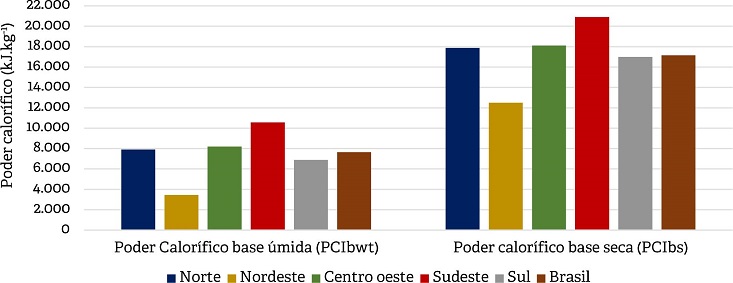 No processo operacional da gaseificação há necessidade de tratamento prévio obrigatório de britagem e secagem, que reduz o peso na fração dos RSU combustível. Considerando este aspecto, foi possível realizar a estimativa do poder calorífico inferior na base seca (PCIbs) para determinar o potencial energético da gaseificação e o poder calorífico inferior na base úmida (PCIbw) para determinar o da incineração para cada macrorregião do Brasil, conforme ilustrado na Figura 2. Percebe-se que cada macrorregião brasileira possui um poder calorífico distinto que é afetado principalmente pelo percentual de matéria orgânica presente no RSU. Em cidades localizadas na região Sudeste, por exemplo, o percentual de matéria orgânica está em torno de 50% enquanto em cidades localizadas na região Nordeste pode ser superior a 57% (Alfaia et al., 2017). Portanto, quanto menor o percentual de matéria orgânica maior o poder calorífico dos resíduos. Dessa forma, para a obtenção de um poder calórico significativo, é mais interessante que as tecnologias WTE sejam instaladas em aglomerados urbanos com maior densidade populacional e de maior renda média econômica, pois a geração de matéria orgânica tende a ser menor quando comparado a regiões com menor renda (Rodrigues et al., 2022). Aspecto este também constatado por autores como (Escamilla-García et al., 2020; Ferraz de Campos et al., 2021; Rodrigues et al., 2022; Vyas et al., 2022).