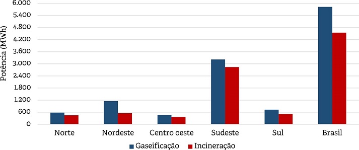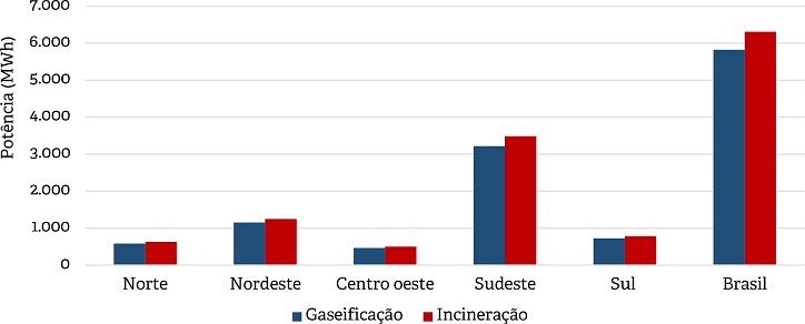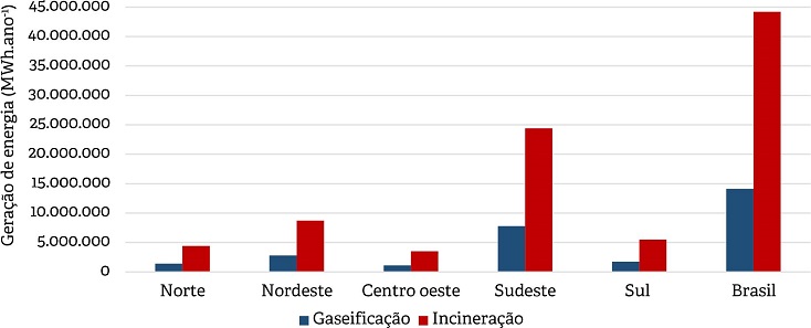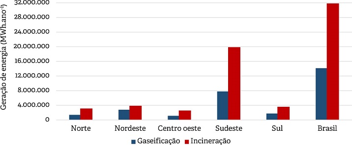 Este artigo analisou o potencial de geração de energia em regiões brasileiras e comparou as tecnologias de gaseificação e incineração nas regiões do Brasil. Para isso, realizou-se o cálculo da geração de resíduos entre as regiões a partir da estimativa populacional, do poder calorífico dos resíduos, da potência disponível e por fim da geração de eletricidade.