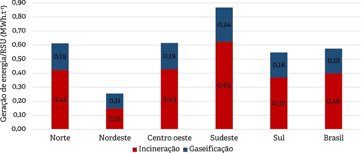 Os resultados apontam que a incineração é a tecnologia com maior eficiência térmica e maior geração de eletricidade por tonelada de RSU, diante do fato de não necessitar de pré-tratamento para resíduos com poder calorífico inferior acima de 6 MJ.kg-1. A incineração é a melhor opção, em comparação a gaseificação, podendo ser considerada uma excelente alternativa para as regiões metropolitanas do Brasil, onde o poder calorífico dos RSU é compatível para a implementação dessa tecnologia. Isso ocorre porque a gaseificação possui restrições de matéria-prima, como a necessidade de um pré-tratamento para homogeneizar os RSU e reduzir a granulometria. Além disso, se faz necessário utilizar resíduos específicos para geração de produtos de qualidade, bem como é necessário a redução da umidade para melhorar a combustibilidade do material. Tais aspectos contribuem em relação ao fato da eficiência de conversão térmica quando comparado a incineração.