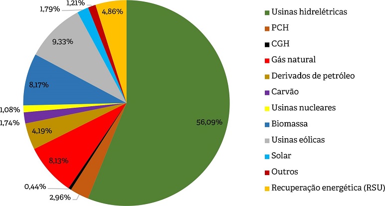 A tecnologia ainda pode ser explorada como uma nova fonte de energia e contribuir com a matriz energética brasileira. Atualmente a principal fonte de energia elétrica do Brasil é proveniente de usinas hidrelétricas, contribuindo com 53,34% da matriz elétrica brasileira (ANEEL, 2023), conforme demonstrado na Figura 8. Ao passo que, considerando os cálculos de potencial energético utilizados neste estudo, a recuperação energética a partir de RSU com as tecnologias de gaseificação e incineração teria contribuição de 4,86% a mais na matriz energética brasileira (Alamu et al., 2021; Gutierrez-Gomez et al., 2021; Padilha & Mesquita, 2022; Rodrigues et al., 2022). Este é um aspecto relevante, visto que, existe a necessidade de diversificar da matriz elétrica brasileira que atualmente é altamente dependente de usinas hidrelétricas, fazendo com que períodos de escassez de chuvas a tarifa de energia aumente e até mesmo ocasione apagões no setor elétrico, como ocorreu entre os anos de 2001 e 2002 (Lara Filho et al., 2019).