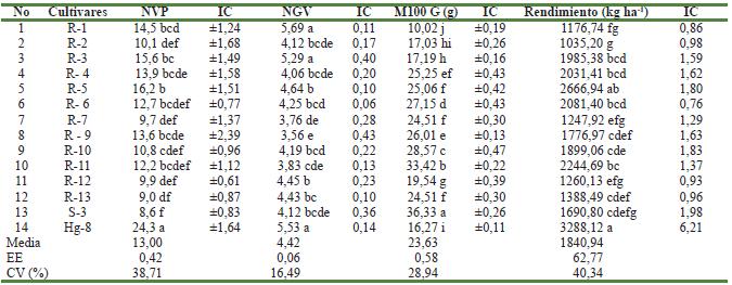 De forma general, se observó gran variación en los componentes del rendimiento de los cultivares evaluados, lo que indica que existe variabilidad entre los mismos, permitiendo esto, hacer selección de los mejores materiales y los de mayor adaptabilidad en las condiciones de esta localidad (9).
