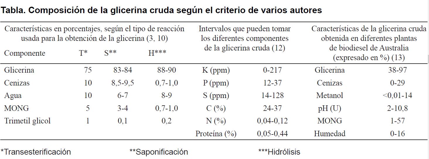 La glicerina cruda constituye una mezcla que contiene diferentes cantidades de glicerina (mayor porcentaje), detergente, alcohol (fundamentalmente metanol), sales de sodio o potasio (10) en dependencia del catalizador usado, materia orgánica no glicerol (MONG) y agua (11). La composición de la glicerina cruda registra marcadas diferencias en los valores reportados por diferentes autores (3, 10, 12, 13) (porcentajes o intervalos) y en el tipo de variables medidas (Tabla). El comienzo y final de los intervalos representan magnitudes marcadamente diferentes para la mayoría de las variables.