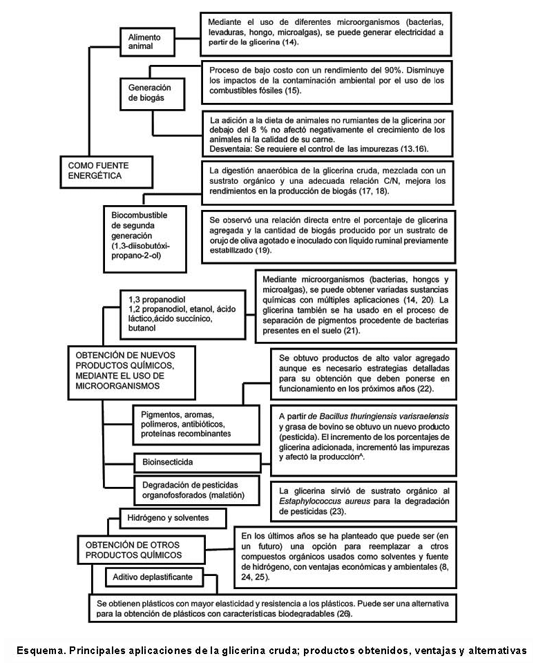 El uso de la glicerina cruda como fuente de energía, en la obtención de diferentes productos químicos mediante el uso de microorganismos y para sintetizar productos químicos en general, son las principales variantes encontradas por diferentes investigadores (Esquema).