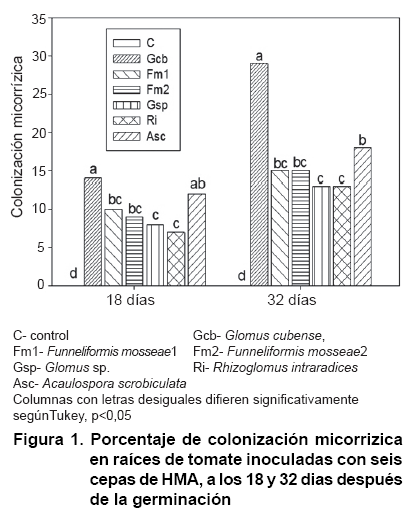 Colonización micorrízica: en las raíces de las plantas control no se observó presencia fúngica (Figura 1). Las raíces de tomate (S. lycopersicum) inoculadas mostraron porcentajes de colonización micorrízica entre 7 y 14 %, a los 18 días, y entre 13 y 29 % a los 32 días, con diferencias significativas entre algunos tratamientos en ambos periodos. Sobresalió el tratamiento con G. cubense con los valores superiores estadísticamente, mientras que las cepas Glomus sp y R. intraradicesmostraron los valores inferiores de colonización, aunque sin diferencias significativas de las cepas F. mosseae.