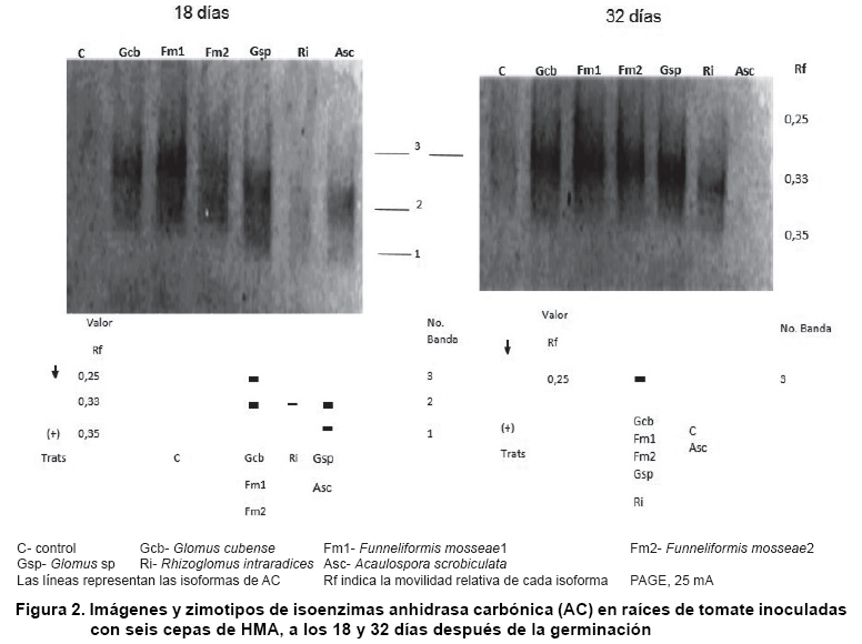 Isoenzimas de AC: en las raíces de las plantas de tomate controles no se apreció actividad AC (Figura 2). En los tratamientos micorrizados, a los 18 días, se observaron tres isoformas, de las cuales la No. 2 con Rf 0,33 apareció en todos aunque con muy baja intensidad en el tratamiento con R. intraradices, la No. 1 con Rf 0,35 se detectó en las raíces inoculadas con Glomus sp. y A. scrobiculata, mientras que en las colonizadas por las cepas G. cubense y ambos F. mosseae se observó la isoenzima No. 3 con Rf 0,25.