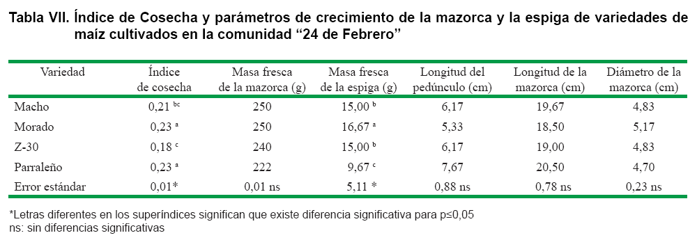 Los parámetros del crecimiento de la mazorca no mostraron diferencias significativas entre variedades. Solamente la masa fresca de la espiga fue estadísticamente superior en la variedad de maíz Morado, siendo la variedad Parraleño la que menor masa fresca de la espiga mostró (Tabla VII).