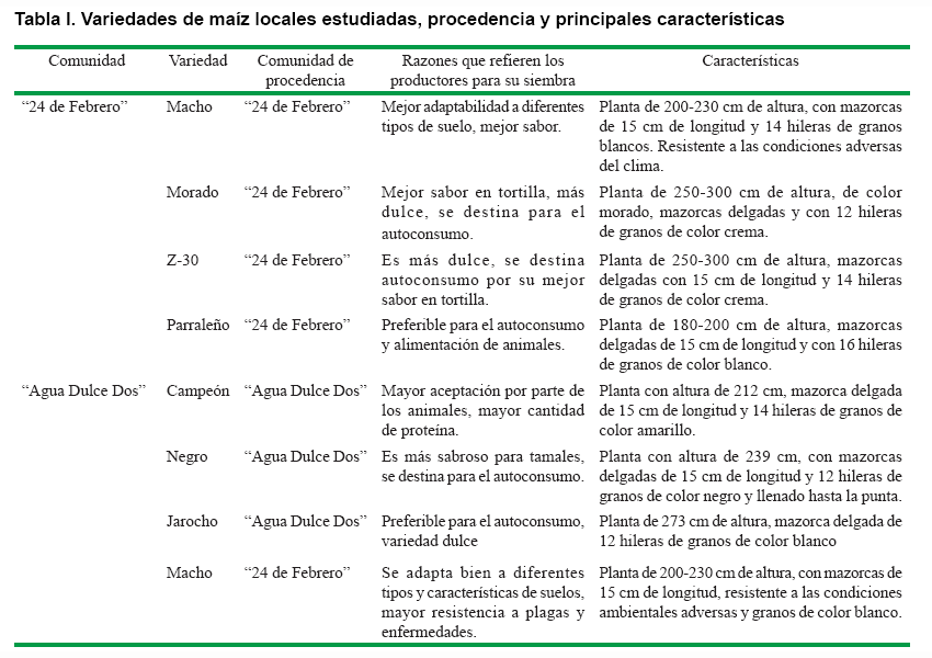 En ambas comunidades se diseñaron experimentos de campo en bloques al azar con tres réplicas. Los tratamientos consistieron en cuatro variedades de maíz locales para ambas comunidades cuya procedencia, preferencia por los productores y características se presentan en la Tabla I, lo cual ofrece datos relevantes ya que la selección de las variedades se realizó en función de los intereses de los productores. En ambas comunidades los experimentos se sembraron los días 23 y 25 de junio de 2013 respectivamente, de forma manual a una distancia de 0,75 m entre hileras y 0,30 m entre plantas. Las dimensiones de las parcelas fueron de 2159 m. para el caso la comunidad “24 de Febrero” y de 1120 m. para “Agua Dulce Dos".