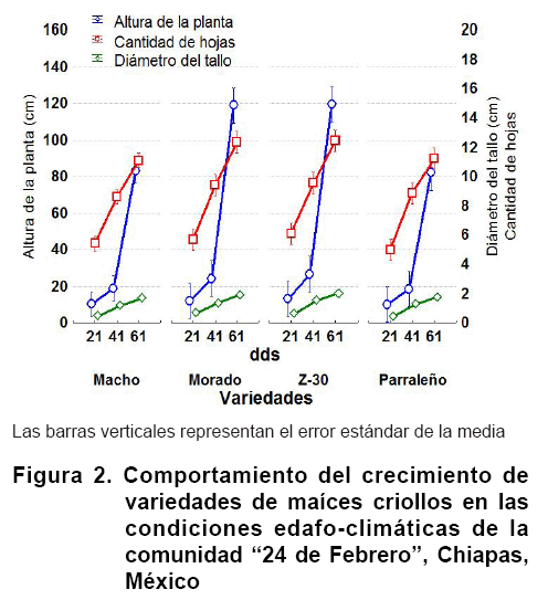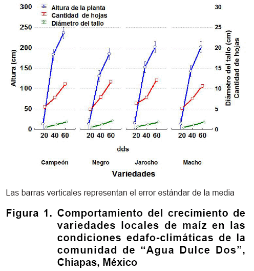 Similares resultados referentes a las características del crecimiento encontradas para las variedades locales de esta investigación fueron obtenidos en un estudio reciente en el que se compararon variedades locales de maíz con potencialidad de uso múltiple para zonas rurales de Chiapas..