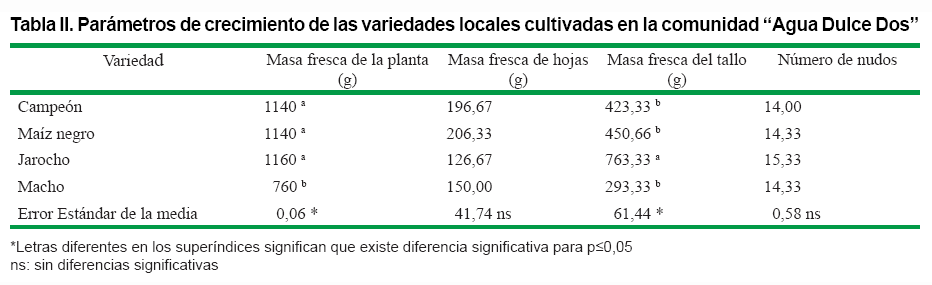 * Las variedades locales de maíz cultivadas en las comunidades "Agua Dulce Dos" y "24 de Febrero" muestran patrones de crecimiento similares, excepto en la altura de la planta. El número de hojas emitidas y el diámetro del tallo oscilaron entre 11 y 12 hojas por planta y 1,7 a 2,0 cm de diámetro respectivamente.