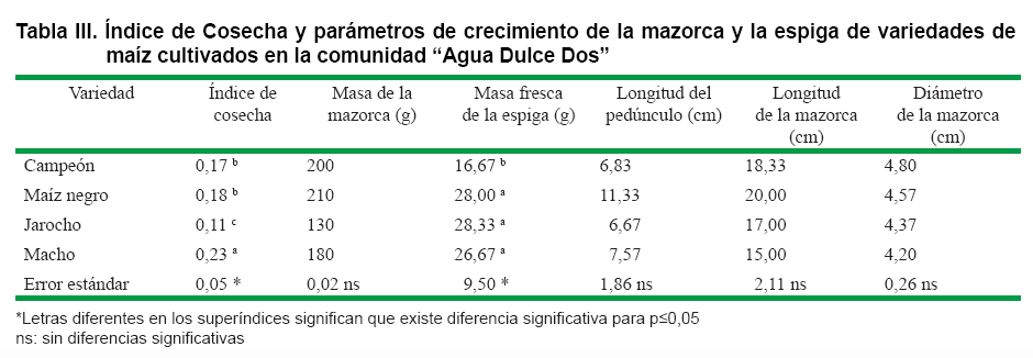* El Índice de Cosecha no sobrepasó el 23 % en todas las variedades y en ambas comunidades, siendo mayor en la variedad Macho, de "Agua Dulce Dos" y se correlacionó negativamente con la altura de la planta. En "24 de Febrero" y a juzgar por los valores de IC, las variedades más eficientes fueron Parraleño y Morado. La acumulación de biomasa en hojas y tallo de los maíces cultivados en "24 de Febrero" varió significativamente entre las variedades y no se observó un patrón definido que mostrara correlación alguna con el índice de cosecha