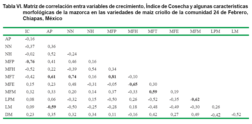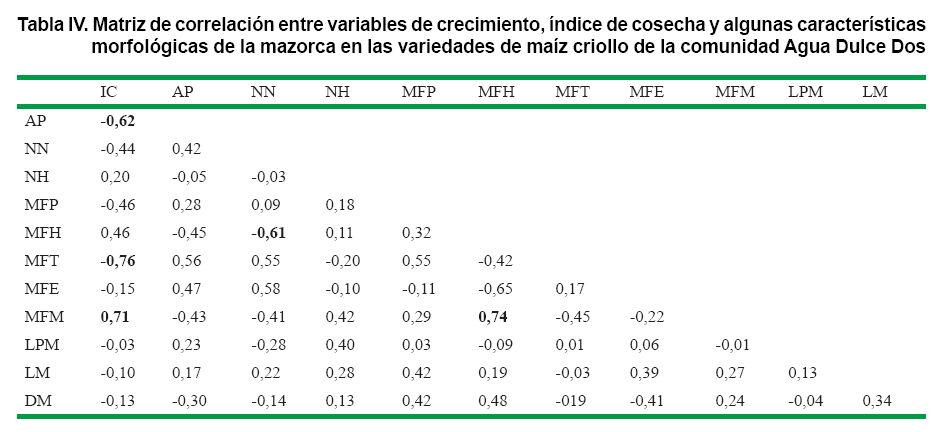 Las variables del crecimiento que más se correlacionaron con el IC fueron la altura de la plata y la masa fresca del tallo, ambas en sentido negativo, así como la masa fresca de la mazorca, la cual se correlacionó positivamente con el IC (Tabla IV); sin embargo, por su concomitancia con el IC, carece de valor para llegar a una conclusión ya sea de tipo metodológica o fisiológica. No obstante estas variables se involucran en la matriz para encontrar posibles correlaciones con otras variables no concomitantes y de interés para la caracterización de las variedades.