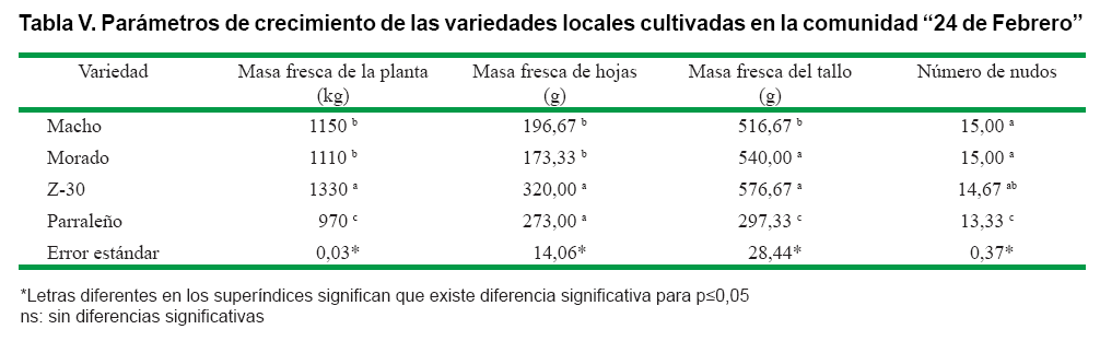 La acumulación de biomasa en las hojas y el tallo fue significativamente diferente entre variedades. Las variedades Z-30 y Parraleño mostraron los mayores valores de masa fresca foliar, mientras que Z-30 y Morado acumularon mayor cantidad de biomasa en el tallo. En cuanto al número de nudos, este fue significativamente mayor en las variedades Macho y Morado (Tabla V).
