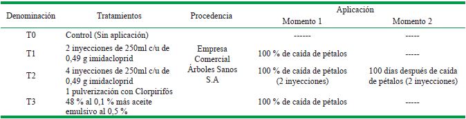 Los tratamientos consistieron en la aplicación de inyecciones al tronco de Imidacloprid y de pulverizaciones con Clorpirifós según se detallan en la Tabla 1.