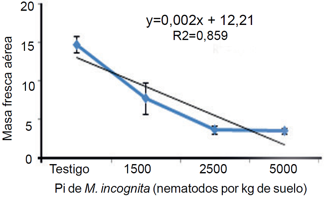 Cuando se incrementó el nivel de inoculo inicial (Pi), se originaron disminuciones en el FR, producto de menores niveles poblacionales finales (Pf). Al respecto, numerosos autores señalaron que altos valores de Pi pueden provocar la existencia de competencia entre los nematodos y como resultado se obtendrán bajos niveles de Pf, debido al deterioro de los sitios de infestación y la acumulación de desechos metabólicos de estos organismos, que afectarían el desarrollo del nematodo (11,22).