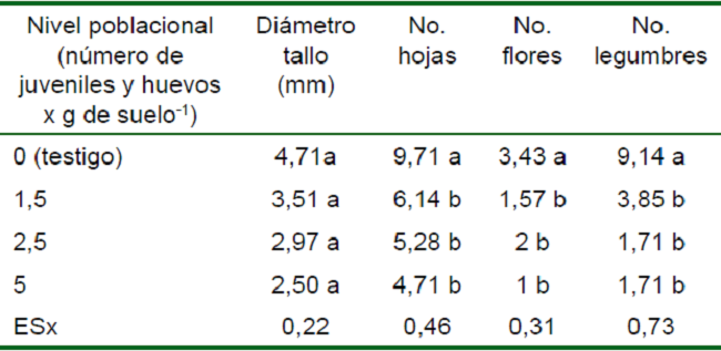 El efecto de los nematodos sobre el desarrollo de las leguminosas fue documentado en otros estudios (8), de ahí que podemos esperar que se produzcan afectaciones en los rendimientos del cultivar, pues en presencia de una generación de M. incognita se produjeron afectaciones, además de la altura y masa fresca de las plantas, en el número de hojas, flores y legumbres (Tabla), resultando conveniente desarrollar este estudio en condiciones de micro-parcelas en el futuro, para llegar al termino del cultivo y evaluar los rendimientos.