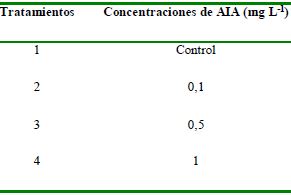 Para el enraizamiento in vitro se empleó el medio de cultivo semisólido, compuesto por las sales propuestas por Murashige y Skoog (MS) 13, a la mitad de concentración de sales (50 %), micronutrientes completos, 100 mg L-1 mio-inositol, tiamina 1 mg L-1, Agar E y 30 g L-1 de sacarosa. Los tratamientos consistieron en diferentes concentraciones de AIA, como se muestra a continuación en la Tabla 1.