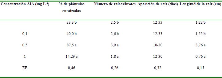 De forma general, los resultados alcanzados en este experimento indican como mejor tratamiento el correspondiente a la concentración 0,5 mg L-1 de AIA, con lo cual se promovió el enraizamiento hasta un 87,5 %, así como el número (3,9) y longitud de las raíces (3,76 cm), lo que podría repercutir sobre el aumento del vigor de los explantes y facilitar la aclimatización directa de las plantas producidas in vitro.