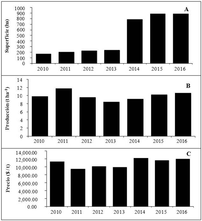 La tendencia al incremento en superficies ocupadas por este cultivo, ocurrió hasta el año 2012. Los indicadores de producción, rendimientos y precios hasta 2016 han sido positivos. Sin embargo, los costos de producción cuando se utilizan los principios de la agricultura de altos insumos, pueden alcanzar desde el establecimiento en campo hasta la primera cosecha un gasto total de alrededor de 8 mil dólares ha-1. Adicionalmente, el productor incrementa sus gastos con el uso de agroquímicos diversos y la población consume un producto probablemente contaminado.