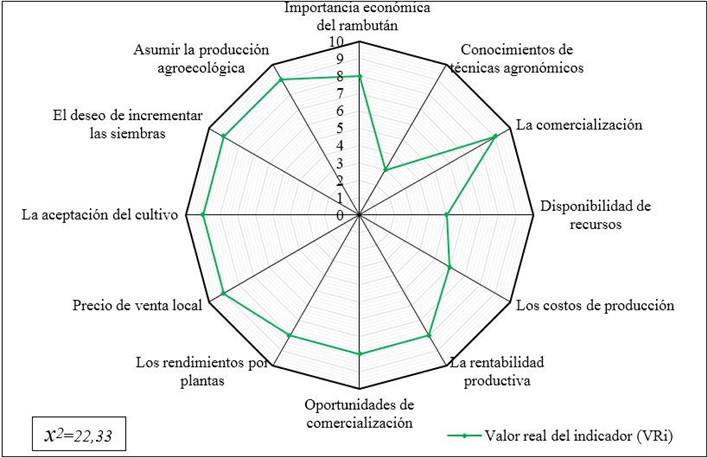 Los resultados del análisis socioeconómico y medioambiental de los indicadores con sus variables también asumen un valor de Índice de aceptación del cultivo (Figura 3), sobre la base de considerar un valor para cada indicador en correspondencia con la información obtenida de los informes, entrevistas a decisores, actores y facilitadores. El valor cualitativo se evaluó a través de una escala ponderada de valores de 0-10 según investigaciones 28.