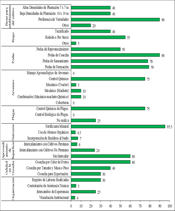La Figura 4 representa la tecnología de producción predominante en el cultivo, haciendo un análisis desde la mirada cuantitativa se percibe que las actividades de máxima prioridad para el productor lo constituyen siete labores de manejo. La nutrición de las plantas, el riego, el manejo de arvenses las podas y las actividades relacionadas con la cosecha, como las más significativas. El conocimiento técnico acerca de estas labores fitotécnicas resulta vital para el éxito productivo.