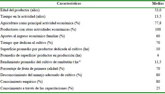 Según la encuesta (Tabla 1), los productores de rambután de la región Soconusco, poseen en promedio más de 50 años de edad y más de 10 en el cultivo como actividad principal, al representar el 60 % de su economía. Más del 70 % de ellos, dedican todas sus energías a este cultivo, que representa el 90 % de la superficie total, las que en promedio alcanzaron 10 ha por productor.
