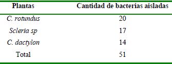 El procedimiento de rizobacterias seguido permitió el aislamiento de 51 bacterias, encontrándose el mayor número de aislados en las plantas herbáceas C. rotundus y Scleria sp. (Tabla 1)