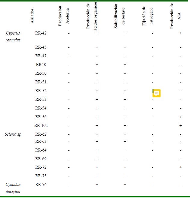 Al comparar, para cada especie de planta, los porcentajes de aislados que presentaron características de promotoras del crecimiento, se encontró que C. rotundus aportó 5 % de aislados capaces de producir acetoína y ácido indolacético, 65 % con capacidad de producir ácidos orgánicos y 60 % de solubilizadores de fosfatos. En Scleria sp. se observó 71 % de aislados productores de ácidos orgánicos y 53 % de solubilizadores de fosfato, así como 6 % de productores de ácido indolacético; no se aislaron fijadores de nitrógeno ni productores de acetoína. Se observó que 36 % de los aislados obtenidos de C. dactylon solubilizaron fosfatos; sin embargo, el 100 % produjo ácidos orgánicos, en tanto cuatro aislados produjeron ácido indolacético y dos fueron capaces de fijar nitrógeno atmosférico, siendo así mismo la planta que más aportó aislados productores de acetoína (21 %).