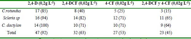 Las herbáceas Scleria sp. y C. dactylon aportaron la mayor proporción de aislados rizosféricos capaces de utilizar los clorofenoles intermediarios de la degradación del 2,4-D (2,4-DCF y 4-CF) como única fuente de carbono.