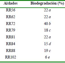 El análisis estadístico de los datos experimentales fue realizado usando el programa Statgraphics Centurion XV. Se realizó un análisis de clasificación simple (ANOVA I) y la prueba de rangos múltiples basada en el procedimiento de diferencia mínima significativa (LSD) de Fisher para la comparación de medias. En todos los casos se utilizó 5 % de significación. Estas pruebas se utilizaron para comparar la degradación del clorofenol y la liberación de cloruro entre los aislados.